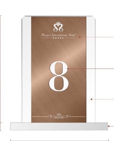 大家可以看到這個酒店餐臺座,簡單的給大家介紹下制作規范:牌上面印有酒店logo是采用絲印銀色,牌上的序號數字制作材質是用3mm厚斜紋細拉不銹鋼,工藝上電鍍咖啡金色、文字鏤空、打磨拋光,亞克力底座使用打磨拋光制成。可以了解到一個小小餐臺座設計師也是很用心為酒店設計制作的,不僅僅要讓酒店滿足還要讓更多的客戶喜歡。