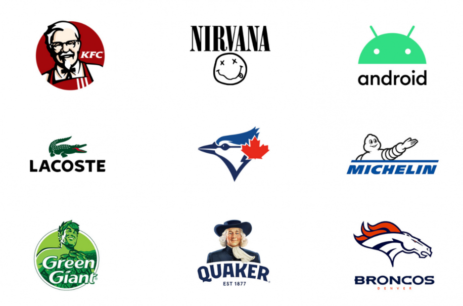 吉祥物徽標(biāo)示例包括:肯德基、涅盤(pán)、Android、拉科斯特、多倫多藍(lán)鳥(niǎo)隊(duì)、米其林、綠巨人、貴格會(huì)和丹佛野馬隊(duì)。